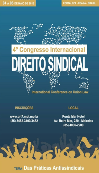 O IV Congresso Internacional de Direito Sindical vai acontecer entre os dias 4 e 6 de maio em Fortaleza. Durante o todo o evento: centrais sindicais, confederações, federações, ministros do Tribunal Superior do Trabalho (TST), juízes do Trabalho, procuradores, desembargadores, deputados federais e estaduais e representantes de entidades do setor, vão reunir na capital cearense para debater o combate a práticas antissindicais. As inscrições podem ser feitas até 18 de abril de 2016.