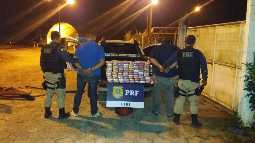 Equipes da PRF faziam a blitz quando abordaram um carro conduzido por um rapaz de 18 anos. Logo em seguida, uma caminhonete também foi parada. Ambos seguiam viagem juntos. O motorista da caminhonete, de 31 anos, apresentou-se como agente penitenciário em Goiás. Entretanto, os policiais verificaram que ele não exercia mais a função. Como estavam muito nervosos, foi iniciada uma revista mais detalhada.